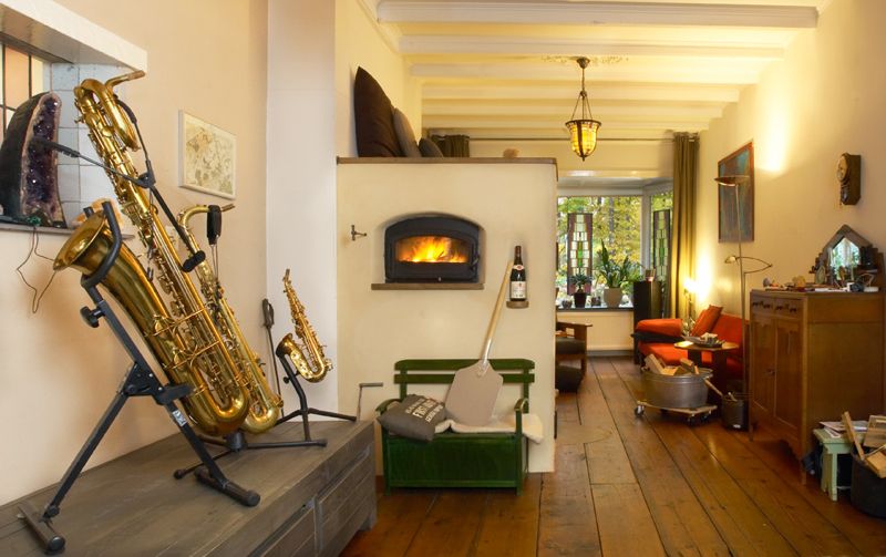 Dit warmtemeubel is uitgebreid met een warme zitplek om te ontspannen. Door de glazen ruit boven het fornuis is er contact tussen het woongedeelte en de keuken. De klant: "We hebben hier veel brandhout voorradig en zien de winter graag tegemoet met dit warme centrum in ons huis".